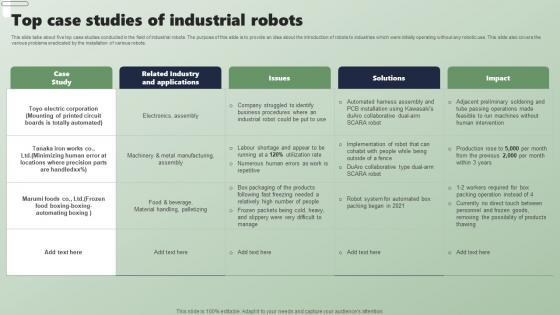 This slide talks about five top case studies conducted in the field of industrial robots. The purpose of this slide is to provide an idea about the introduction of robots to industries which were initially operating without any robotic use. This slide also covers the various problems eradicated by the installation of various robots. From laying roadmaps to briefing everything in detail, our templates are perfect for you. You can set the stage with your presentation slides. All you have to do is download these easy-to-edit and customizable templates. Top Case Studies Of Industrial Robots Applications Of Industrial Robots Portrait Pdf will help you deliver an outstanding performance that everyone would remember and praise you for. Do download this presentation today. This slide talks about five top case studies conducted in the field of industrial robots. The purpose of this slide is to provide an idea about the introduction of robots to industries which were initially operating without any robotic use. This slide also covers the various problems eradicated by the installation of various robots.