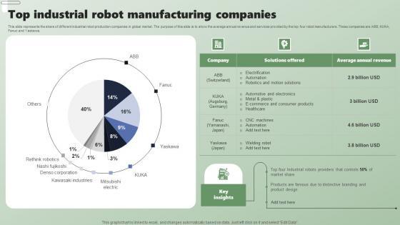 This slide represents the share of different industrial robot production companies in global market. The purpose of this slide is to show the average annual revenue and services provided by the top four robot manufacturers. These companies are ABB, KUKA, Fanuc and Yaskawa. Present like a pro with Top Industrial Robot Manufacturing Companies Applications Of Industrial Robots Download Pdf Create beautiful presentations together with your team, using our easy-to-use presentation slides. Share your ideas in real-time and make changes on the fly by downloading our templates. So whether you are in the office, on the go, or in a remote location, you can stay in sync with your team and present your ideas with confidence. With Slidegeeks presentation got a whole lot easier. Grab these presentations today. This slide represents the share of different industrial robot production companies in global market. The purpose of this slide is to show the average annual revenue and services provided by the top four robot manufacturers. These companies are ABB, KUKA, Fanuc and Yaskawa.