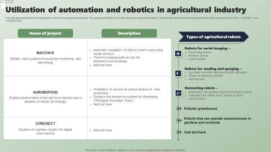 This slide demonstrates the use of automation and robotics in agricultural industry. The purpose of this slide is to outline the types of agricultural robots. This slide also talks about some agricultural robotic R and D projects like BACCHUS, COROSECT and AGROBOFOOD. Slidegeeks is here to make your presentations a breeze with Utilization Of Automation And Robotics In Applications Of Industrial Robots Introduction Pdf With our easy-to-use and customizable templates, you can focus on delivering your ideas rather than worrying about formatting. With a variety of designs to choose from, you are sure to find one that suits your needs. And with animations and unique photos, illustrations, and fonts, you can make your presentation pop. So whether you are giving a sales pitch or presenting to the board, make sure to check out Slidegeeks first This slide demonstrates the use of automation and robotics in agricultural industry. The purpose of this slide is to outline the types of agricultural robots. This slide also talks about some agricultural robotic R and D projects like BACCHUS, COROSECT and AGROBOFOOD.