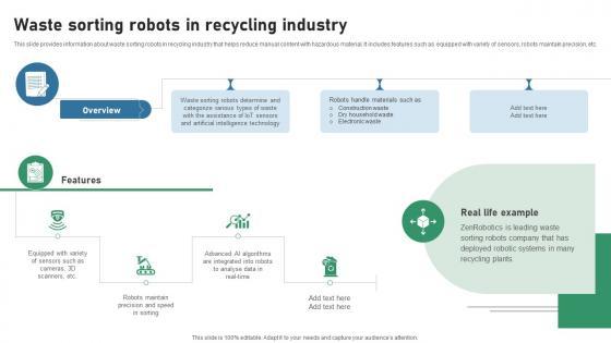 This slide provides information about waste sorting robots in recycling industry that helps reduce manual content with hazardous material. It includes features such as equipped with variety of sensors, robots maintain precision, etc. Do you have an important presentation coming up Are you looking for something that will make your presentation stand out from the rest Look no further than Waste Sorting Robots In Recycling Industry IOT Applications In Smart Waste IoT SS V. With our professional designs, you can trust that your presentation will pop and make delivering it a smooth process. And with Slidegeeks, you can trust that your presentation will be unique and memorable. So why wait Grab Waste Sorting Robots In Recycling Industry IOT Applications In Smart Waste IoT SS V today and make your presentation stand out from the rest This slide provides information about waste sorting robots in recycling industry that helps reduce manual content with hazardous material. It includes features such as equipped with variety of sensors, robots maintain precision, etc.
