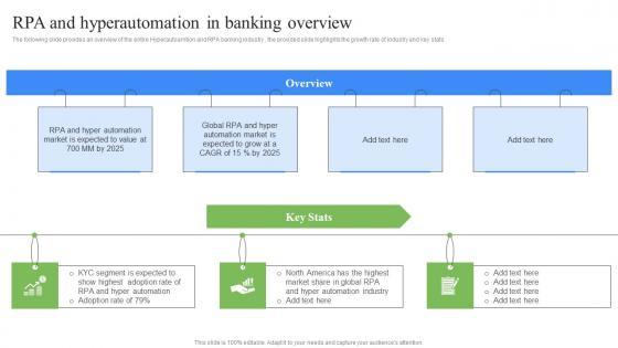 The following slide provides an overview of the entire Hyperautoamtion and RPA banking industry, the provided slide highlights the growth rate of industry and key stats. This RPA And Hyperautomation In Banking Overview RPA Influence On Industries Icons Pdf from Slidegeeks makes it easy to present information on your topic with precision. It provides customization options, so you can make changes to the colors, design, graphics, or any other component to create a unique layout. It is also available for immediate download, so you can begin using it right away. Slidegeeks has done good research to ensure that you have everything you need to make your presentation stand out. Make a name out there for a brilliant performance. The following slide provides an overview of the entire Hyperautoamtion and RPA banking industry, the provided slide highlights the growth rate of industry and key stats.