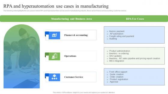 The following slide highlights the use cases in which RPA and Hyperautoamtion can be used in manufacturing Industry, these can be finance and accounting, Customer service. Find a pre-designed and impeccable RPA And Hyperautomation Use Cases In Manufacturing RPA Influence On Industries Sample Pdf. The templates can ace your presentation without additional effort. You can download these easy-to-edit presentation templates to make your presentation stand out from others. So, what are you waiting for Download the template from Slidegeeks today and give a unique touch to your presentation. The following slide highlights the use cases in which RPA and Hyperautoamtion can be used in manufacturing Industry, these can be finance and accounting, Customer service.