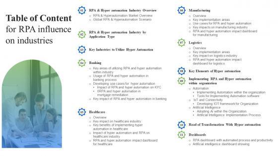From laying roadmaps to briefing everything in detail, our templates are perfect for you. You can set the stage with your presentation slides. All you have to do is download these easy-to-edit and customizable templates. Table Of Content RPA Use Cases In Different Industries And Business PPT Sample AI SS V will help you deliver an outstanding performance that everyone would remember and praise you for. Do download this presentation today. Our Table Of Content RPA Use Cases In Different Industries And Business PPT Sample AI SS V are topically designed to provide an attractive backdrop to any subject. Use them to look like a presentation pro.