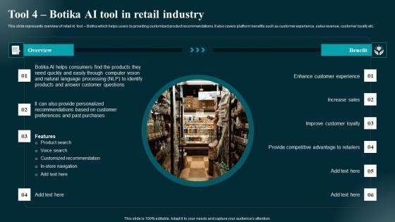 This slide represents overview of retail AI tool Botika which helps users by providing customized product recommendations. It also covers platform benefits such as customer experience, sales revenue, customer loyalty etc. The Tool 4 Botika AI Tool In Retail Industry Applications And Impact Introduction Pdf is a compilation of the most recent design trends as a series of slides. It is suitable for any subject or industry presentation, containing attractive visuals and photo spots for businesses to clearly express their messages. This template contains a variety of slides for the user to input data, such as structures to contrast two elements, bullet points, and slides for written information. Slidegeeks is prepared to create an impression. This slide represents overview of retail AI tool Botika which helps users by providing customized product recommendations. It also covers platform benefits such as customer experience, sales revenue, customer loyalty etc.