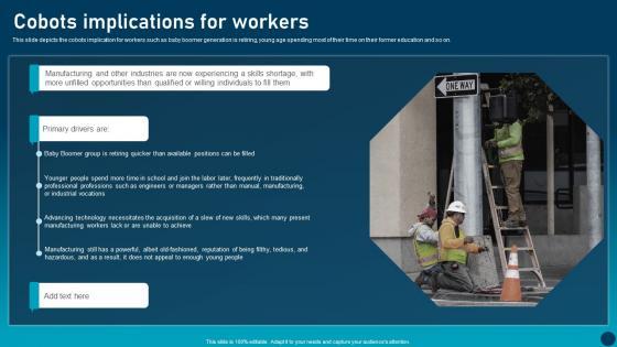 This slide depicts the cobots implication for workers such as baby boomer generation is retiring, young age spending most of their time on their former education and so on. From laying roadmaps to briefing everything in detail, our templates are perfect for you. You can set the stage with your presentation slides. All you have to do is download these easy to edit and customizable templates. Cobots Implications For Workers Transforming Industries With Collaborative Robotics Graphics Pdf will help you deliver an outstanding performance that everyone would remember and praise you for. Do download this presentation today. This slide depicts the cobots implication for workers such as baby boomer generation is retiring, young age spending most of their time on their former education and so on.