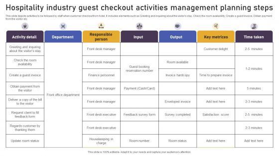 This slide depicts activities to be followed by staff when customer checkout from hotel. It includes elements such as Greeting and inquiring about the visitors stay, Check the room availability, Create a guest invoice, Obtain payment from the visitor etc. Showcasing this set of slides titled Hospitality Industry Guest Checkout Activities Management Planning Steps Themes Pdf. The topics addressed in these templates are Activity Detail, Department, Responsible Person. All the content presented in this PPT design is completely editable. Download it and make adjustments in color, background, font etc. as per your unique business setting. This slide depicts activities to be followed by staff when customer checkout from hotel. It includes elements such as Greeting and inquiring about the visitors stay, Check the room availability, Create a guest invoice, Obtain payment from the visitor etc.