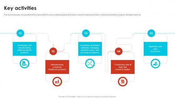 This slide showcases core operations that company performs such as developing pharma products, consumer healthcare products, conducting clinical trials, products marketing and sales, etc. Get a simple yet stunning designed Key Activities Pharma Industry Business Canvas Model BMC SS V. It is the best one to establish the tone in your meetings. It is an excellent way to make your presentations highly effective. So, download this PPT today from Slidegeeks and see the positive impacts. Our easy-to-edit Key Activities Pharma Industry Business Canvas Model BMC SS V can be your go-to option for all upcoming conferences and meetings. So, what are you waiting for Grab this template today. This slide showcases core operations that company performs such as developing pharma products, consumer healthcare products, conducting clinical trials, products marketing and sales, etc.