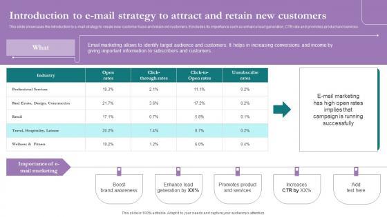 This slide showcases the introduction to e mail strategy to create new customer base and retain old customers. It includes its importance such as enhance lead generation, CTR rate and promotes product and services. Do you know about Slidesgeeks Introduction To E Mail Strategy Attract Comprehensive Marketing Guide For Tourism Industry Structure Pdf These are perfect for delivering any kind od presentation. Using it, create PowerPoint presentations that communicate your ideas and engage audiences. Save time and effort by using our pre designed presentation templates that are perfect for a wide range of topic. Our vast selection of designs covers a range of styles, from creative to business, and are all highly customizable and easy to edit. Download as a PowerPoint template or use them as Google Slides themes. This slide showcases the introduction to e mail strategy to create new customer base and retain old customers. It includes its importance such as enhance lead generation, CTR rate and promotes product and services.