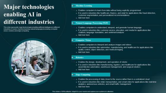 This slide represents major technologies enabling artificial intelligence in different industries. It covers machine learning, natural language processing, computer vision, robotics and edge computing. Present like a pro with Major Technologies Enabling AI In Different Industries Applications And Impact Portrait Pdf Create beautiful presentations together with your team, using our easy-to-use presentation slides. Share your ideas in real-time and make changes on the fly by downloading our templates. So whether you are in the office, on the go, or in a remote location, you can stay in sync with your team and present your ideas with confidence. With Slidegeeks presentation got a whole lot easier. Grab these presentations today. This slide represents major technologies enabling artificial intelligence in different industries. It covers machine learning, natural language processing, computer vision, robotics and edge computing.