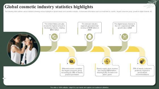 The following slide outlines various statistics showing various highlights of global beauty and cosmetics industry. It showcases information such as investment by country, largest consumer group, growth in digital channel, etc. Formulating a presentation can take up a lot of effort and time, so the content and message should always be the primary focus. The visuals of the PowerPoint can enhance the presenters message, so our Global Cosmetic Industry Statistics Highlights Successful Launch Ppt Sample was created to help save time. Instead of worrying about the design, the presenter can concentrate on the message while our designers work on creating the ideal templates for whatever situation is needed. Slidegeeks has experts for everything from amazing designs to valuable content, we have put everything into Global Cosmetic Industry Statistics Highlights Successful Launch Ppt Sample The following slide outlines various statistics showing various highlights of global beauty and cosmetics industry. It showcases information such as investment by country, largest consumer group, growth in digital channel, etc.