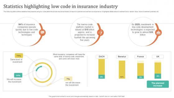 The following slide outlines statistics that presents using low code platforms across insurance industry to improve customer and self service experience. It highlights details about investment level, market value, future investment potential, etc. Are you in need of a template that can accommodate all of your creative concepts This one is crafted professionally and can be altered to fit any style. Use it with Google Slides or PowerPoint. Include striking photographs, symbols, depictions, and other visuals. Fill, move around, or remove text boxes as desired. Test out color palettes and font mixtures. Edit and save your work, or work with colleagues. Download Technology Trends In Online Insurance Statistics Highlighting Low Code In Insurance Industry and observe how to make your presentation outstanding. Give an impeccable presentation to your group and make your presentation unforgettable. The following slide outlines statistics that presents using low code platforms across insurance industry to improve customer and self service experience. It highlights details about investment level, market value, future investment potential, etc.