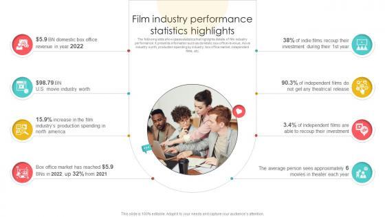 The following slide showcases statistics that highlights details of film industry performance. It presents information such as domestic box office revenue, movie industry worth, production spending by industry, box office market, independent films, etc. If your project calls for a presentation, then Slidegeeks is your go-to partner because we have professionally designed, easy-to-edit templates that are perfect for any presentation. After downloading, you can easily edit Marketing Channels For Movie Film Industry Performance Statistics Highlights Strategy SS V and make the changes accordingly. You can rearrange slides or fill them with different images. Check out all the handy templates The following slide showcases statistics that highlights details of film industry performance. It presents information such as domestic box office revenue, movie industry worth, production spending by industry, box office market, independent films, etc.
