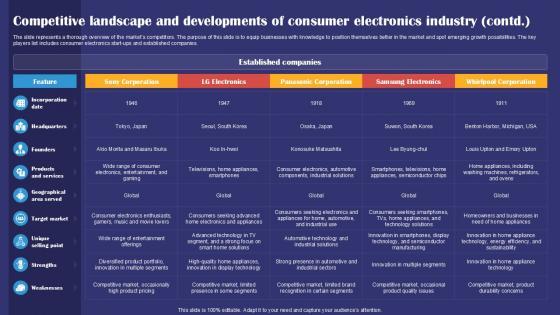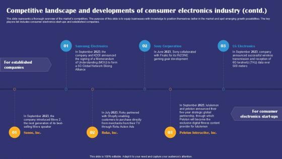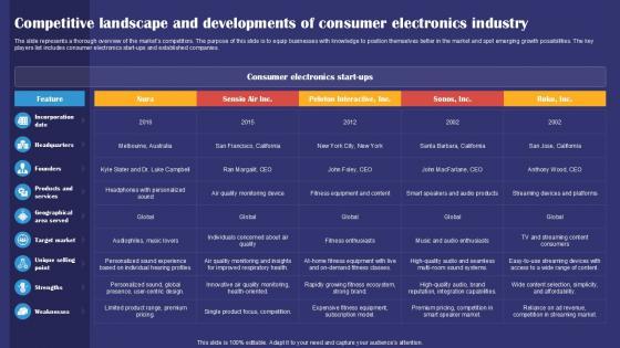 The slide represents a thorough overview of the markets competitors. The purpose of this slide is to equip businesses with knowledge to position themselves better in the market and spot emerging growth possibilities. The key players list includes consumer electronics start ups and established companies. Slidegeeks is one of the best resources for PowerPoint templates. You can download easily and regulate Competitive Landscape And Developments Smartphones Industry Report PPT Slides IR SS V for your personal presentations from our wonderful collection. A few clicks is all it takes to discover and get the most relevant and appropriate templates. Use our Templates to add a unique zing and appeal to your presentation and meetings. All the slides are easy to edit and you can use them even for advertisement purposes. The slide represents a thorough overview of the markets competitors. The purpose of this slide is to equip businesses with knowledge to position themselves better in the market and spot emerging growth possibilities. The key players list includes consumer electronics start ups and established companies.