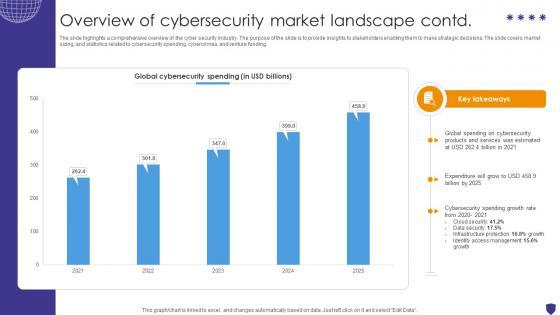 The slide highlights a comprehensive overview of the cyber security industry. The purpose of the slide is to provide insights to stakeholders enabling them to make strategic decisions. The slide covers market sizing, and statistics related to cybersecurity spending, cybercrimes, and venture funding. This modern and well-arranged Global Data Security Industry Report Overview Of Cybersecurity Market Landscape IR SS V provides lots of creative possibilities. It is very simple to customize and edit with the Powerpoint Software. Just drag and drop your pictures into the shapes. All facets of this template can be edited with Powerpoint, no extra software is necessary. Add your own material, put your images in the places assigned for them, adjust the colors, and then you can show your slides to the world, with an animated slide included. The slide highlights a comprehensive overview of the cyber security industry. The purpose of the slide is to provide insights to stakeholders enabling them to make strategic decisions. The slide covers market sizing, and statistics related to cybersecurity spending, cybercrimes, and venture funding.