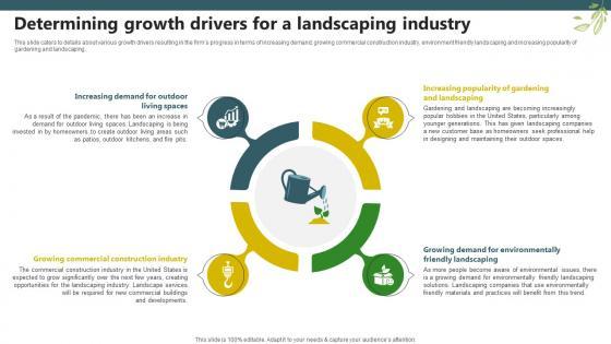 This slide caters to details about various growth drivers resulting in the firms progress in terms of increasing demand, growing commercial construction industry, environment friendly landscaping and increasing popularity of gardening and landscaping. Slidegeeks is here to make your presentations a breeze with Determining Growth Drivers For A Landscaping Industry Lawn Care BP SS V With our easy-to-use and customizable templates, you can focus on delivering your ideas rather than worrying about formatting. With a variety of designs to choose from, you are sure to find one that suits your needs. And with animations and unique photos, illustrations, and fonts, you can make your presentation pop. So whether you are giving a sales pitch or presenting to the board, make sure to check out Slidegeeks first This slide caters to details about various growth drivers resulting in the firms progress in terms of increasing demand, growing commercial construction industry, environment friendly landscaping and increasing popularity of gardening and landscaping.