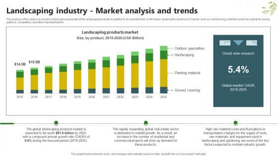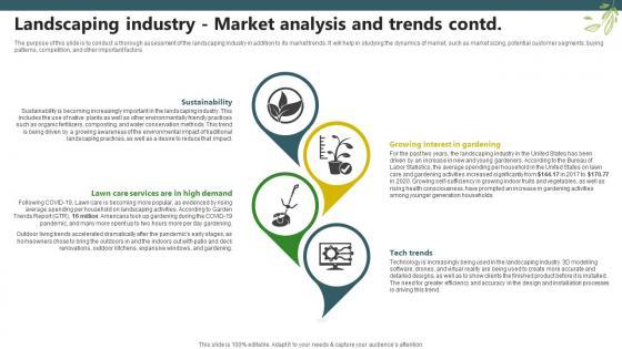 The purpose of this slide is to conduct a thorough assessment of the landscaping industry in addition to its market trends. It will help in studying the dynamics of market, such as market sizing, potential customer segments, buying patterns, competition, and other important factors. This modern and well-arranged Landscaping Industry Market Analysis And Trends Lawn Care BP SS V provides lots of creative possibilities. It is very simple to customize and edit with the Powerpoint Software. Just drag and drop your pictures into the shapes. All facets of this template can be edited with Powerpoint, no extra software is necessary. Add your own material, put your images in the places assigned for them, adjust the colors, and then you can show your slides to the world, with an animated slide included. The purpose of this slide is to conduct a thorough assessment of the landscaping industry in addition to its market trends. It will help in studying the dynamics of market, such as market sizing, potential customer segments, buying patterns, competition, and other important factors.