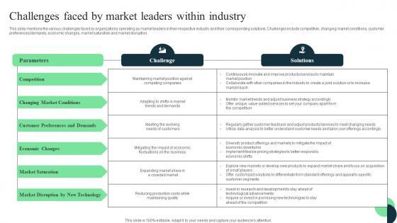 This slide mentions the various challenges faced by organizations operating as market leaders in their respective industry and their corresponding solutions. Challenges include competition, changing market conditions, customer preferences or demands, economic changes, market saturation and market disruption. From laying roadmaps to briefing everything in detail, our templates are perfect for you. You can set the stage with your presentation slides. All you have to do is download these easy-to-edit and customizable templates. Market Leaders Guide To Influence Challenges Faced By Market Leaders Within Industry Formats Pdf will help you deliver an outstanding performance that everyone would remember and praise you for. Do download this presentation today. This slide mentions the various challenges faced by organizations operating as market leaders in their respective industry and their corresponding solutions. Challenges include competition, changing market conditions, customer preferences or demands, economic changes, market saturation and market disruption.