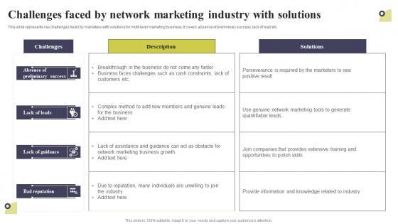 This slide represents key challenges faced by marketers with solutions for multi level marketing business. It covers absence of preliminary success, lack of lead etc. Do you have an important presentation coming up Are you looking for something that will make your presentation stand out from the rest Look no further than Challenges Faced By Network Marketing Industry With Solutions Multi Level Marketing Download Pdf With our professional designs, you can trust that your presentation will pop and make delivering it a smooth process. And with Slidegeeks, you can trust that your presentation will be unique and memorable. So why wait Grab Challenges Faced By Network Marketing Industry With Solutions Multi Level Marketing Download Pdf today and make your presentation stand out from the rest. This slide represents key challenges faced by marketers with solutions for multi level marketing business. It covers absence of preliminary success, lack of lead etc.