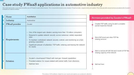 This slide represents a case study about the use of FWaaS in automotive industry. The components include name, industry, FWaaS provider, requirements and solution. This slide also talks about services provided by the Zscalers Firewall-as-a-service solution. Present like a pro with Case Study Fwaas Applications In Automotive Industry Network Security Clipart Pdf Create beautiful presentations together with your team, using our easy-to-use presentation slides. Share your ideas in real-time and make changes on the fly by downloading our templates. So whether you are in the office, on the go, or in a remote location, you can stay in sync with your team and present your ideas with confidence. With Slidegeeks presentation got a whole lot easier. Grab these presentations today. This slide represents a case study about the use of FWaaS in automotive industry. The components include name, industry, FWaaS provider, requirements and solution. This slide also talks about services provided by the Zscalers Firewall-as-a-service solution.