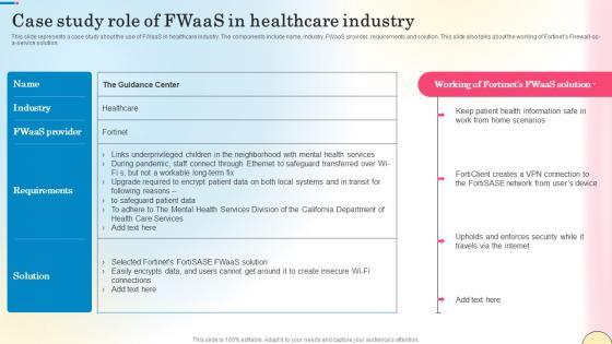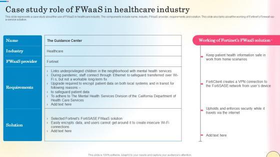 This slide represents a case study about the use of FWaaS in healthcare industry. The components include name, industry, FWaaS provider, requirements and solution. This slide also talks about the working of Fortinets Firewall-as-a-service solution. Slidegeeks is here to make your presentations a breeze with Case Study Role Of Fwaas In Healthcare Industry Network Security Slides Pdf With our easy-to-use and customizable templates, you can focus on delivering your ideas rather than worrying about formatting. With a variety of designs to choose from, you are sure to find one that suits your needs. And with animations and unique photos, illustrations, and fonts, you can make your presentation pop. So whether you are giving a sales pitch or presenting to the board, make sure to check out Slidegeeks first This slide represents a case study about the use of FWaaS in healthcare industry. The components include name, industry, FWaaS provider, requirements and solution. This slide also talks about the working of Fortinets Firewall-as-a-service solution.