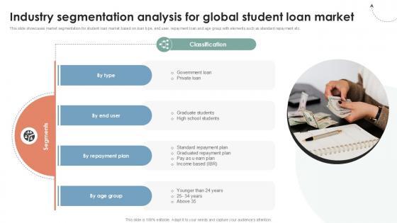 This slide showcases market segmentation for student loan market based on loan type, end user, repayment loan and age group with elements such as standard repayment etc. Retrieve professionally designed Industry Segmentation Analysis For Globa Global Consumer Financial Ppt Sample CRP DK SS V to effectively convey your message and captivate your listeners. Save time by selecting pre-made slideshows that are appropriate for various topics, from business to educational purposes. These themes come in many different styles, from creative to corporate, and all of them are easily adjustable and can be edited quickly. Access them as PowerPoint templates or as Google Slides themes. You do not have to go on a hunt for the perfect presentation because Slidegeeks got you covered from everywhere. This slide showcases market segmentation for student loan market based on loan type, end user, repayment loan and age group with elements such as standard repayment etc.
