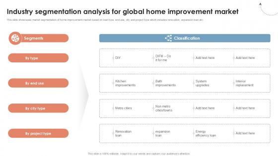 This slide showcases market segmentation of home improvement market based on loan type, end use, city and project type which includes renovation, expansion loan etc. Slidegeeks has constructed Industry Segmentation Analysis For Global Consumer Financial Ppt Template CRP DK SS V after conducting extensive research and examination. These presentation templates are constantly being generated and modified based on user preferences and critiques from editors. Here, you will find the most attractive templates for a range of purposes while taking into account ratings and remarks from users regarding the content. This is an excellent jumping-off point to explore our content and will give new users an insight into our top-notch PowerPoint Templates. This slide showcases market segmentation of home improvement market based on loan type, end use, city and project type which includes renovation, expansion loan etc.