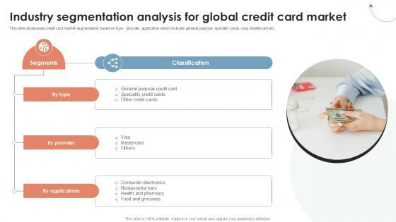 This slide showcases credit card market segmentation based on type , provider, application which includes general purpose, specialty cards, visa, Mastercard etc. Here you can discover an assortment of the finest PowerPoint and Google Slides templates. With these templates, you can create presentations for a variety of purposes while simultaneously providing your audience with an eye-catching visual experience. Download Industry Segmentation Analysis Global Consumer Financial Ppt Sample CRP DK SS V to deliver an impeccable presentation. These templates will make your job of preparing presentations much quicker, yet still, maintain a high level of quality. Slidegeeks has experienced researchers who prepare these templates and write high-quality content for you. Later on, you can personalize the content by editing the Industry Segmentation Analysis Global Consumer Financial Ppt Sample CRP DK SS V. This slide showcases credit card market segmentation based on type , provider, application which includes general purpose, specialty cards, visa, Mastercard etc.