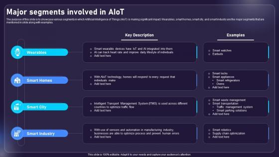 The purpose of this slide is to showcase various segments in which Artificial Intelligence of Things AIoT is making significant impact. Wearables, smart homes, smart city, and smart industry are the major segments that are mentioned in slide along with examples. This Major Segments Involved In AIOT Applications For Various Industries IoT SS V from Slidegeeks makes it easy to present information on your topic with precision. It provides customization options, so you can make changes to the colors, design, graphics, or any other component to create a unique layout. It is also available for immediate download, so you can begin using it right away. Slidegeeks has done good research to ensure that you have everything you need to make your presentation stand out. Make a name out there for a brilliant performance. The purpose of this slide is to showcase various segments in which Artificial Intelligence of Things AIoT is making significant impact. Wearables, smart homes, smart city, and smart industry are the major segments that are mentioned in slide along with examples.
