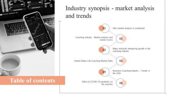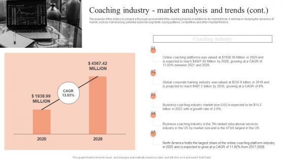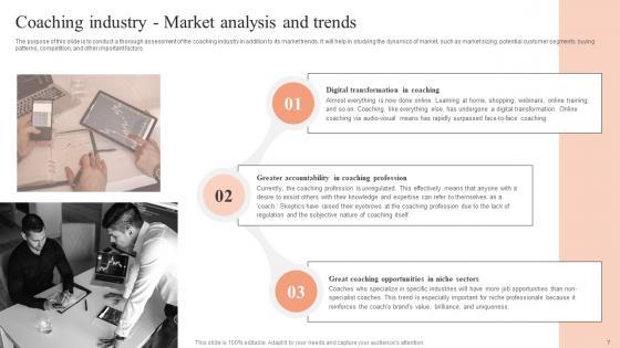 The purpose of this slide is to conduct a thorough assessment of the coaching industry in addition to its market trends. It will help in studying the dynamics of market, such as market sizing, potential customer segments, buying patterns, competition, and other important factors. Boost your pitch with our creative Industry Synopsis Market Analysis Coaching Industry Market Analysis And Trends Download Pdf. Deliver an awe-inspiring pitch that will mesmerize everyone. Using these presentation templates you will surely catch everyones attention. You can browse the ppts collection on our website. We have researchers who are experts at creating the right content for the templates. So you do not have to invest time in any additional work. Just grab the template now and use them. The purpose of this slide is to conduct a thorough assessment of the coaching industry in addition to its market trends. It will help in studying the dynamics of market, such as market sizing, potential customer segments, buying patterns, competition, and other important factors.