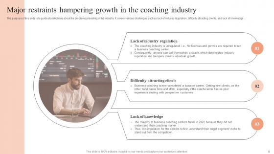 The purpose of this slide is to guide stakeholders about the problems prevailing in the industry. It covers various challenges such as lack of industry regulation, difficulty attracting clients, and lack of knowledge. Slidegeeks is one of the best resources for PowerPoint templates. You can download easily and regulate Industry Synopsis Market Analysis Major Restraints Hampering Growth In The Coaching Industry Graphics Pdf for your personal presentations from our wonderful collection. A few clicks is all it takes to discover and get the most relevant and appropriate templates. Use our Templates to add a unique zing and appeal to your presentation and meetings. All the slides are easy to edit and you can use them even for advertisement purposes. The purpose of this slide is to guide stakeholders about the problems prevailing in the industry. It covers various challenges such as lack of industry regulation, difficulty attracting clients, and lack of knowledge.