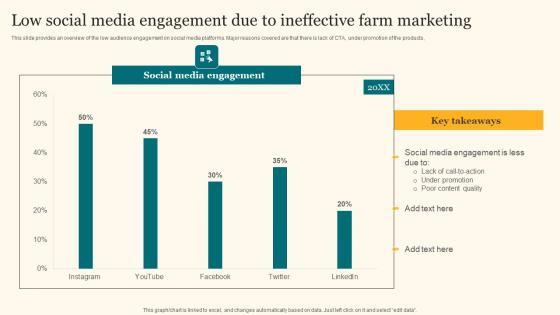 This slide provides an overview of the low audience engagement on social media platforms. Major reasons covered are that there is lack of CTA, under promotion of the products. Slidegeeks has constructed Low Social Media Engagement Due To Ineffective Agricultural Product Promotion Brochure Pdf after conducting extensive research and examination. These presentation templates are constantly being generated and modified based on user preferences and critiques from editors. Here, you will find the most attractive templates for a range of purposes while taking into account ratings and remarks from users regarding the content. This is an excellent jumping-off point to explore our content and will give new users an insight into our top-notch PowerPoint Templates. This slide provides an overview of the low audience engagement on social media platforms. Major reasons covered are that there is lack of CTA, under promotion of the products.