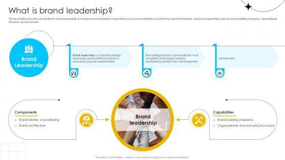 This template covers the introduction to brand leadership. It includes brand leadership components such as brand identity or positioning, brand architecture, and brand capabilities such as brand-building programs, organizational structure, and processes. Take your projects to the next level with our ultimate collection of Brand Influence What Is Brand Leadership Strategy SS V. Slidegeeks has designed a range of layouts that are perfect for representing task or activity duration, keeping track of all your deadlines at a glance. Tailor these designs to your exact needs and give them a truly corporate look with your own brand colors they will make your projects stand out from the rest This template covers the introduction to brand leadership. It includes brand leadership components such as brand identity or positioning, brand architecture, and brand capabilities such as brand-building programs, organizational structure, and processes.