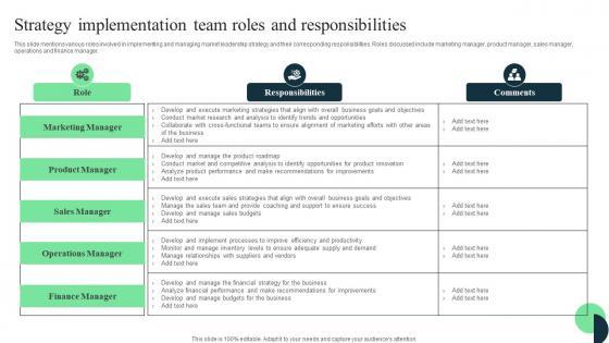 This slide mentions various roles involved in implementing and managing market leadership strategy and their corresponding responsibilities. Roles discussed include marketing manager, product manager, sales manager, operations and finance manager. Whether you have daily or monthly meetings, a brilliant presentation is necessary. Market Leaders Guide To Influence Strategy Implementation Team Roles Background Pdf can be your best option for delivering a presentation. Represent everything in detail using Market Leaders Guide To Influence Strategy Implementation Team Roles Background Pdf and make yourself stand out in meetings. The template is versatile and follows a structure that will cater to your requirements. All the templates prepared by Slidegeeks are easy to download and edit. Our research experts have taken care of the corporate themes as well. So, give it a try and see the results. This slide mentions various roles involved in implementing and managing market leadership strategy and their corresponding responsibilities. Roles discussed include marketing manager, product manager, sales manager, operations and finance manager.