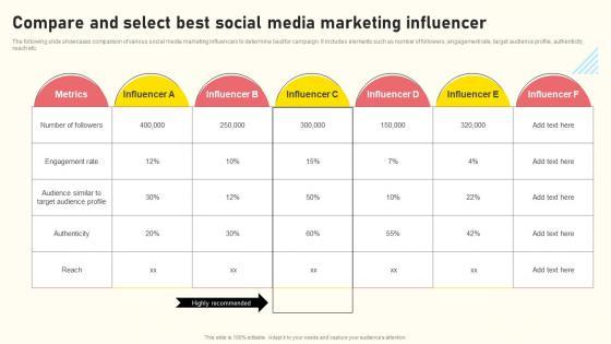 The following slide showcases comparison of various social media marketing influencers to determine best for campaign. It includes elements such as number of followers, engagement rate, target audience profile, authenticity, reach etc. There are so many reasons you need a Compare And Select Best Social Media Marketing Influencer Ppt Infographic Template Background PDF. The first reason is you can not spend time making everything from scratch, Thus, Slidegeeks has made presentation templates for you too. You can easily download these templates from our website easily.