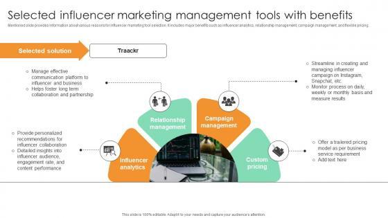 Mentioned slide provides information about various reasons for influencer marketing tool selection. It includes major benefits such as influencer analytics, relationship management, campaign management, and flexible pricing.Slidegeeks has constructed Selected Influencer Marketing Management Tools Comprehensive Guide For Marketing Technology after conducting extensive research and examination. These presentation templates are constantly being generated and modified based on user preferences and critiques from editors. Here, you will find the most attractive templates for a range of purposes while taking into account ratings and remarks from users regarding the content. This is an excellent jumping-off point to explore our content and will give new users an insight into our top-notch PowerPoint Templates. Mentioned slide provides information about various reasons for influencer marketing tool selection. It includes major benefits such as influencer analytics, relationship management, campaign management, and flexible pricing.