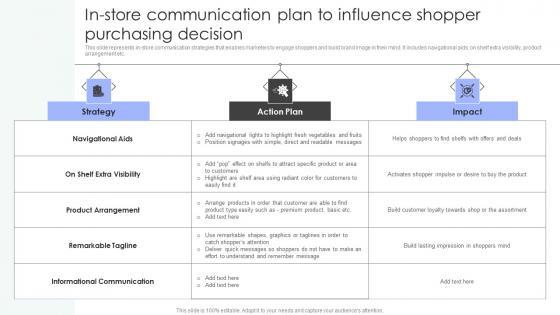 This slide represents in-store communication strategies that enables marketers to engage shoppers and build brand image in their mind. It includes navigational aids, on shelf extra visibility, product arrangement etc. Make sure to capture your audiences attention in your business displays with our gratis customizable Shopper Marketing Strategy To Enhance In Store Communication Plan To Influence Shopper Slides Pdf. These are great for business strategies, office conferences, capital raising or task suggestions. If you desire to acquire more customers for your tech business and ensure they stay satisfied, create your own sales presentation with these plain slides. This slide represents in-store communication strategies that enables marketers to engage shoppers and build brand image in their mind. It includes navigational aids, on shelf extra visibility, product arrangement etc.