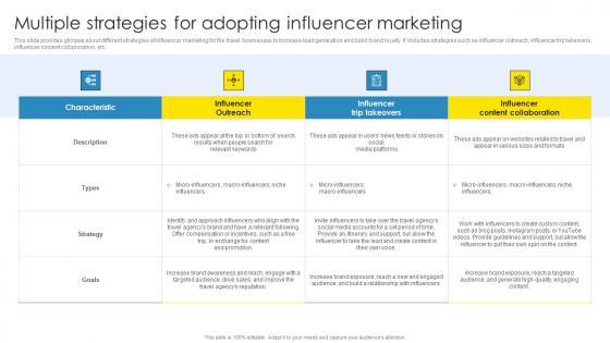 This slide provides glimpse about different strategies of local events sponsorships for the travel businesses to increase lead generation and build brand loyalty. It includes strategies such as community events, art and cultural events, food and beverage events, etc. Here you can discover an assortment of the finest PowerPoint and Google Slides templates. With these templates, you can create presentations for a variety of purposes while simultaneously providing your audience with an eye-catching visual experience. Download Strategic Marketing Plan Multiple Strategies For Adopting Influencer Marketing Professional Pdf to deliver an impeccable presentation. These templates will make your job of preparing presentations much quicker, yet still, maintain a high level of quality. Slidegeeks has experienced researchers who prepare these templates and write high-quality content for you. Later on, you can personalize the content by editing the Strategic Marketing Plan Multiple Strategies For Adopting Influencer Marketing Professional Pdf. This slide provides glimpse about different strategies of local events sponsorships for the travel businesses to increase lead generation and build brand loyalty. It includes strategies such as community events, art and cultural events, food and beverage events, etc.