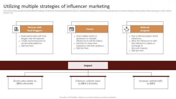 This slide provides glimpse about the different strategies of influencer marketing that helps the bakery to adopt these strategies for enhancing customer base. It includes strategies such as partner with food bloggers, events, referral program, etc.Create an editable Utilizing Multiple Strategies Of Influencer Marketing Strategic Advertising Plan For Bakehouse Professional Pdf that communicates your idea and engages your audience. Whether you are presenting a business or an educational presentation, pre designed presentation templates help save time. Utilizing Multiple Strategies Of Influencer Marketing Strategic Advertising Plan For Bakehouse Professional Pdf is highly customizable and very easy to edit, covering many different styles from creative to business presentations. Slidegeeks has creative team members who have crafted amazing templates. So, go and get them without any delay. This slide provides glimpse about the different strategies of influencer marketing that helps the bakery to adopt these strategies for enhancing customer base. It includes strategies such as partner with food bloggers, events, referral program, etc.