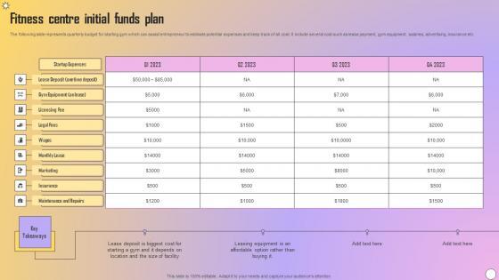 The following slide represents quarterly budget for starting gym which can assist entrepreneur to estimate potential expenses and keep track of all cost. It include several cost such as lease payment, gym equipment, salaries, advertising, insurance etc. Pitch your topic with ease and precision using this Fitness Centre Initial Funds Plan Information Pdf. This layout presents information on Lease Deposit, Gym Equipment, Licensing Fee. It is also available for immediate download and adjustment. So, changes can be made in the color, design, graphics or any other component to create a unique layout. The following slide represents quarterly budget for starting gym which can assist entrepreneur to estimate potential expenses and keep track of all cost. It include several cost such as lease payment, gym equipment, salaries, advertising, insurance etc.
