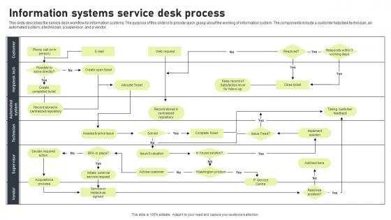 This slide describes the service desk workflow for information systems. The purpose of this slide is to provide quick grasp about the working of information system. The components include a customer helpdesk technician, an automated system, a technician, a supervisor, and a vendor. Pitch your topic with ease and precision using this Information Systems Service Desk Process Summary Pdf. This layout presents information on Vendor, Supervisor, Helpdesk Tech. It is also available for immediate download and adjustment. So, changes can be made in the color, design, graphics or any other component to create a unique layout. This slide describes the service desk workflow for information systems. The purpose of this slide is to provide quick grasp about the working of information system. The components include a customer helpdesk technician, an automated system, a technician, a supervisor, and a vendor.