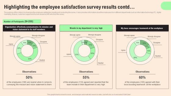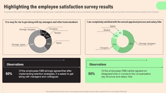 The purpose of this slide is to exhibit the staff satisfaction survey results. Organizations can evaluate the employee satisfaction level based on the survey results and can further implement employee retention tactics if required. Here you can discover an assortment of the finest PowerPoint and Google Slides templates. With these templates, you can create presentations for a variety of purposes while simultaneously providing your audience with an eye catching visual experience. Download Highlighting Employee Satisfaction HR Retention Techniques For Business Owners Information Pdf to deliver an impeccable presentation. These templates will make your job of preparing presentations much quicker, yet still, maintain a high level of quality. Slidegeeks has experienced researchers who prepare these templates and write high quality content for you. Later on, you can personalize the content by editing the Highlighting Employee Satisfaction HR Retention Techniques For Business Owners Information Pdf. The purpose of this slide is to exhibit the staff satisfaction survey results. Organizations can evaluate the employee satisfaction level based on the survey results and can further implement employee retention tactics if required.