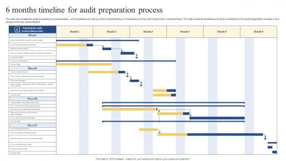 The slide showcases the audit preparation process timeline, which assists in providing a direct understanding of what tasks are to be performed within what timeframe. The slide presents elements such as the schedule for the audit preparation process in four phases with a six month timeline. Showcasing this set of slides titled 6 Months Timeline For Audit Preparation Process Information Pdf. The topics addressed in these templates are Schedule Audit, Preparation Process, Team Meeting , Discussions Pre Audit Findings. All the content presented in this PPT design is completely editable. Download it and make adjustments in color, background, font etc. as per your unique business setting. The slide showcases the audit preparation process timeline, which assists in providing a direct understanding of what tasks are to be performed within what timeframe. The slide presents elements such as the schedule for the audit preparation process in four phases with a six month timeline.