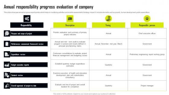 This slide showcase annual progress report pointer which helps in monitoring activities and enable assessment of strategy impact. It include elements such as poverty, human development, public expenditure Showcasing this set of slides titled Annual Responsibility Progress Evaluation Of Company Information Pdf The topics addressed in these templates are Responsibility, Performance Assessment, Framework Review All the content presented in this PPT design is completely editable. Download it and make adjustments in color, background, font etc. as per your unique business setting. This slide showcase annual progress report pointer which helps in monitoring activities and enable assessment of strategy impact. It include elements such as poverty, human development, public expenditure