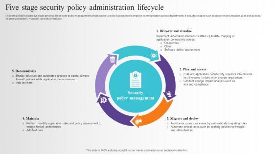 Following slide includes five stage process for security policy management which can be used by businesses to improve communication across departments. It includes stages such as discover and visualize, plan and assess, migrate and deploy, maintain, and decommission. Pitch your topic with ease and precision using this Five Stage Security Policy Administration Lifecycle Pictures Pdf. This layout presents information on Plan And Assess, Migrate And Deploy, Maintain, Decommission. It is also available for immediate download and adjustment. So, changes can be made in the color, design, graphics or any other component to create a unique layout. Following slide includes five stage process for security policy management which can be used by businesses to improve communication across departments. It includes stages such as discover and visualize, plan and assess, migrate and deploy, maintain, and decommission.