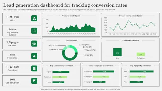 This slide covers the KPI dashboard for tracking lead conversion rates. It includes metrics such as visitors, average session rate, per visit, bounce rate, page views, etc. Make sure to capture your audiences attention in your business displays with our gratis customizable Optimizing Client Lead Handling Lead Generation Dashboard For Tracking Information Pdf. These are great for business strategies, office conferences, capital raising or task suggestions. If you desire to acquire more customers for your tech business and ensure they stay satisfied, create your own sales presentation with these plain slides. This slide covers the KPI dashboard for tracking lead conversion rates. It includes metrics such as visitors, average session rate, per visit, bounce rate, page views, etc.