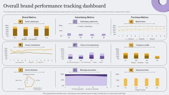 This slide provides information regarding brand performance tracking dashboard capturing KPIs such as brand metric, brand commitment, advertising metrics, and purchase metrics. Here you can discover an assortment of the finest PowerPoint and Google Slides templates. With these templates, you can create presentations for a variety of purposes while simultaneously providing your audience with an eye catching visual experience. Download Overall Brand Performance Tracking Dashboard Toolkit For Brand Planning Information Pdf to deliver an impeccable presentation. These templates will make your job of preparing presentations much quicker, yet still, maintain a high level of quality. Slidegeeks has experienced researchers who prepare these templates and write high quality content for you. Later on, you can personalize the content by editing the Overall Brand Performance Tracking Dashboard Toolkit For Brand Planning Information Pdf. This slide provides information regarding brand performance tracking dashboard capturing KPIs such as brand metric, brand commitment, advertising metrics, and purchase metrics.