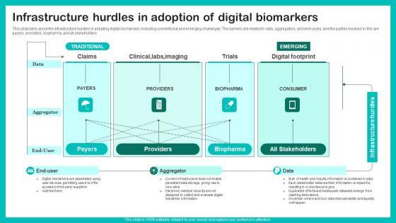 This slide talks about the infrastructure hurdles in adopting digital biomarkers, including conventional and emerging challenges. The barriers are related to data, aggregators, and end users, and the parties involved in this are payers, providers, biopharma, and all stakeholders. Make sure to capture your audiences attention in your business displays with our gratis customizable Infrastructure Hurdles Adoption Digital Biomarkers For Personalized Health Insights Designs Pdf. These are great for business strategies, office conferences, capital raising or task suggestions. If you desire to acquire more customers for your tech business and ensure they stay satisfied, create your own sales presentation with these plain slides. This slide talks about the infrastructure hurdles in adopting digital biomarkers, including conventional and emerging challenges. The barriers are related to data, aggregators, and end users, and the parties involved in this are payers, providers, biopharma, and all stakeholders.