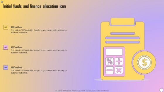Pitch your topic with ease and precision using this Initial Funds And Finance Allocation Icon Clipart Pdf. This layout presents information on Initial Funds, Finance Allocation. It is also available for immediate download and adjustment. So, changes can be made in the color, design, graphics or any other component to create a unique layout. Our Initial Funds And Finance Allocation Icon Clipart Pdf are topically designed to provide an attractive backdrop to any subject. Use them to look like a presentation pro.