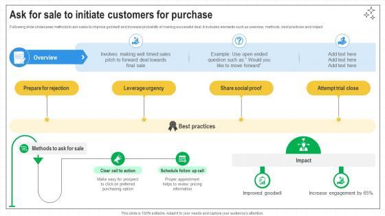 Following slide showcases methods to ask sales to improve goodwill and increase probability of making successful deal. It includes elements such as overview, methods, best practices and impact. Do you have to make sure that everyone on your team knows about any specific topic I yes, then you should give Closing Techniques To Seal Ask For Sale To Initiate Customers For Purchase SA SS V a try. Our experts have put a lot of knowledge and effort into creating this impeccable Closing Techniques To Seal Ask For Sale To Initiate Customers For Purchase SA SS V. You can use this template for your upcoming presentations, as the slides are perfect to represent even the tiniest detail. You can download these templates from the Slidegeeks website and these are easy to edit. So grab these today Following slide showcases methods to ask sales to improve goodwill and increase probability of making successful deal. It includes elements such as overview, methods, best practices and impact.