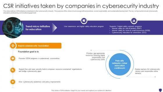 The slide outlines CSR initiatives undertaken by the cybersecurity industry. The purpose of the slide is to encourage ethical practices, social responsibility, and sustainable development. The key components include cybersecurity education and training, community engagement. From laying roadmaps to briefing everything in detail, our templates are perfect for you. You can set the stage with your presentation slides. All you have to do is download these easy-to-edit and customizable templates. Global Data Security Industry Report Csr Initiatives Taken By Companies In Cybersecurity Industry IR SS V will help you deliver an outstanding performance that everyone would remember and praise you for. Do download this presentation today. The slide outlines CSR initiatives undertaken by the cybersecurity industry. The purpose of the slide is to encourage ethical practices, social responsibility, and sustainable development. The key components include cybersecurity education and training, community engagement.